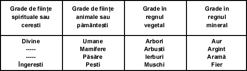 Să se remarce cu atenție că deși clasele numite în tabelul de mai sus sunt distincte și separate, totuși între ele se poate face o comparație astfel: Cel mai înalt grad de minerale este inferior sau cu puțin mai prejos decât cel mai ((A177)) jos grad de vegetale, deoarece în vegetale există viață. Așa deci, cel mai înalt grad de vegetale este cu puțin mai prejos decât cel mai jos grad de viață animală, deoarece viața animală, chiar și în formele cele mai joase, are destulă inteligență ca să fie conștientă de existență. Tot așa este și omul: deși cea mai înălțată dintre ființele animale sau pământești, este „cu puțin mai prejos decât îngerii”, fiindcă îngerii sunt ființe spirituale sau cerești.